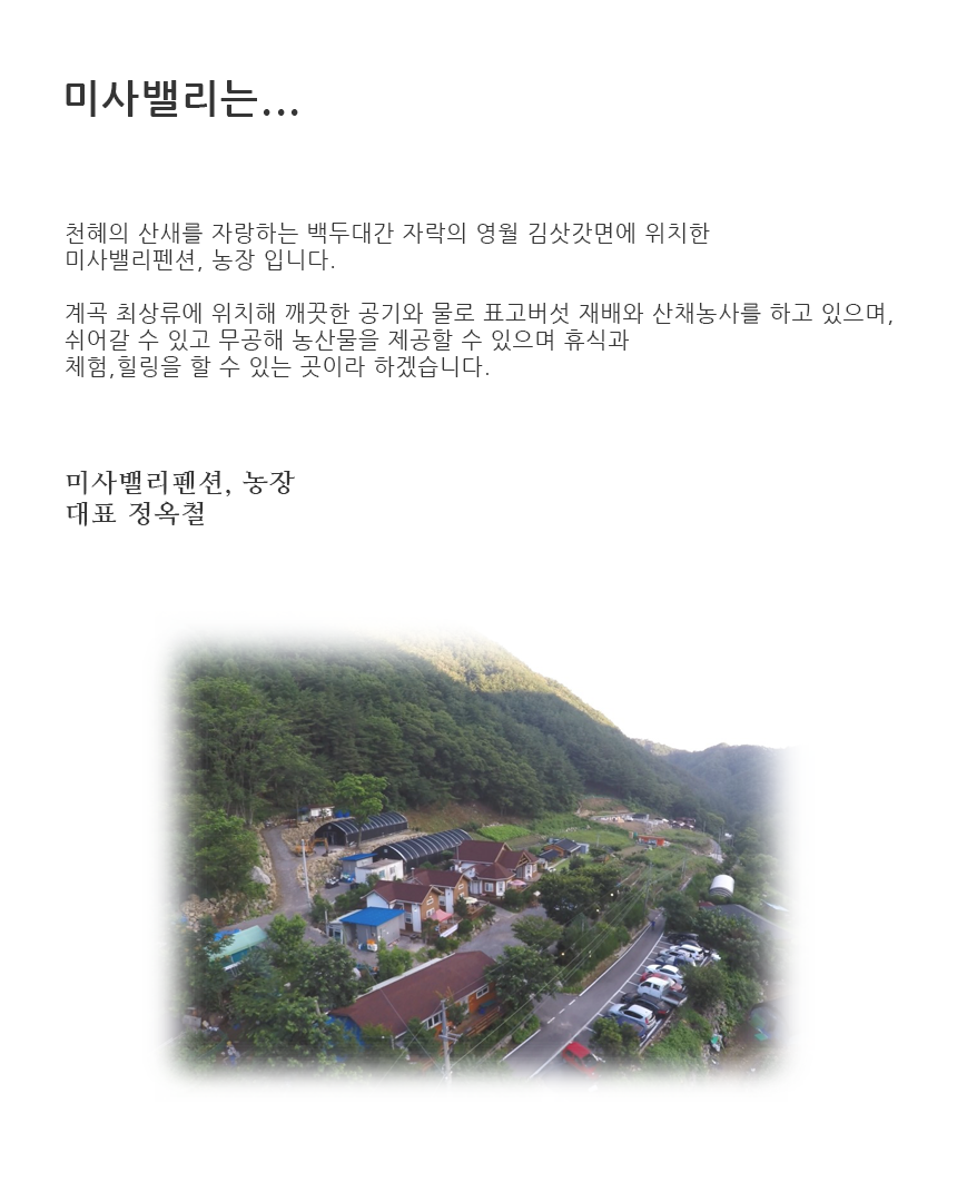 회사명 : 미사밸리 | 사업자등록번호 : 217-05-18097 [사업자정보확인] | 주소 : 강원도 영월군 김삿갓면 와석리 185-4 미사밸리펜션 농장